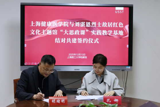 12月12日下午,上海健康医学院与刘湛恩烈士故居红色文化主题馆“大思政课”实践教学基地结对共建签约仪式在上海理工大学档案馆会议室顺利举行。上海健康医学院马克思主义学院院长胡绪明,党委宣传部副部长、马克思主义学院副院长曹月柱,上海理工大学党委宣传部副部长李凡,档案馆馆长孔娜等相关人员出席仪式。仪式由孔娜主持。
